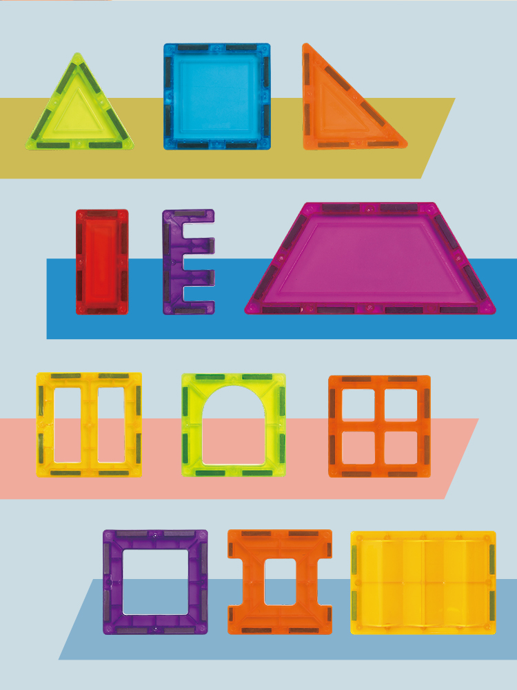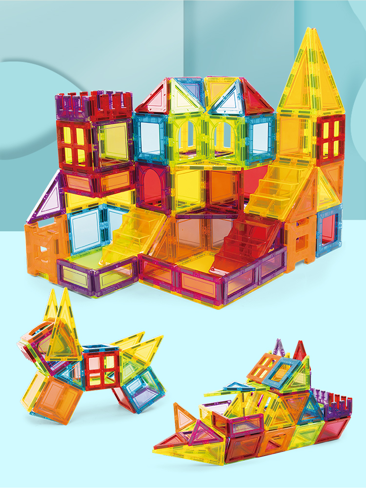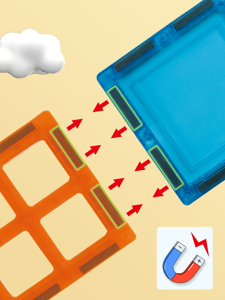 Piesele se conectează ușor datorită magneților puternici, permițând copiilor să creeze diverse forme, căsuțe, turnuri, castele sau chiar lucrări artistice originale. Un set de construcție magnetică combină distracția, creativitatea și estetica, dezvoltând motricitatea fină, imaginația și simțul pentru frumos.